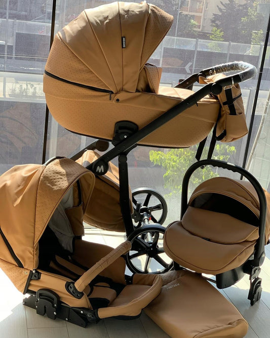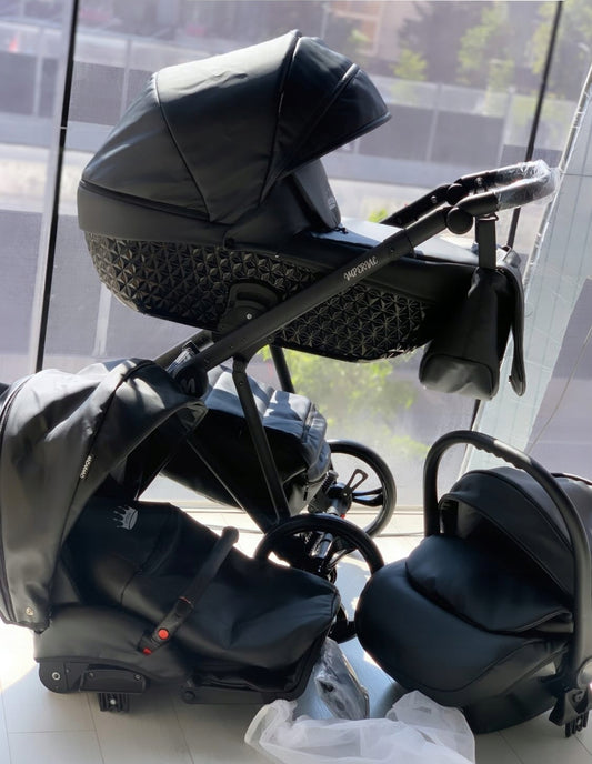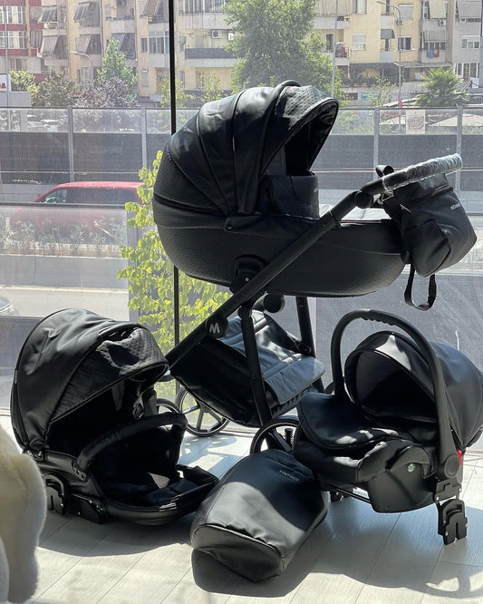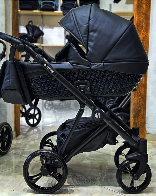 MOMMO IMPERIAL Ekskluzywny Wózek Dziecięcy - Czarna Eko Skóra - 3w1