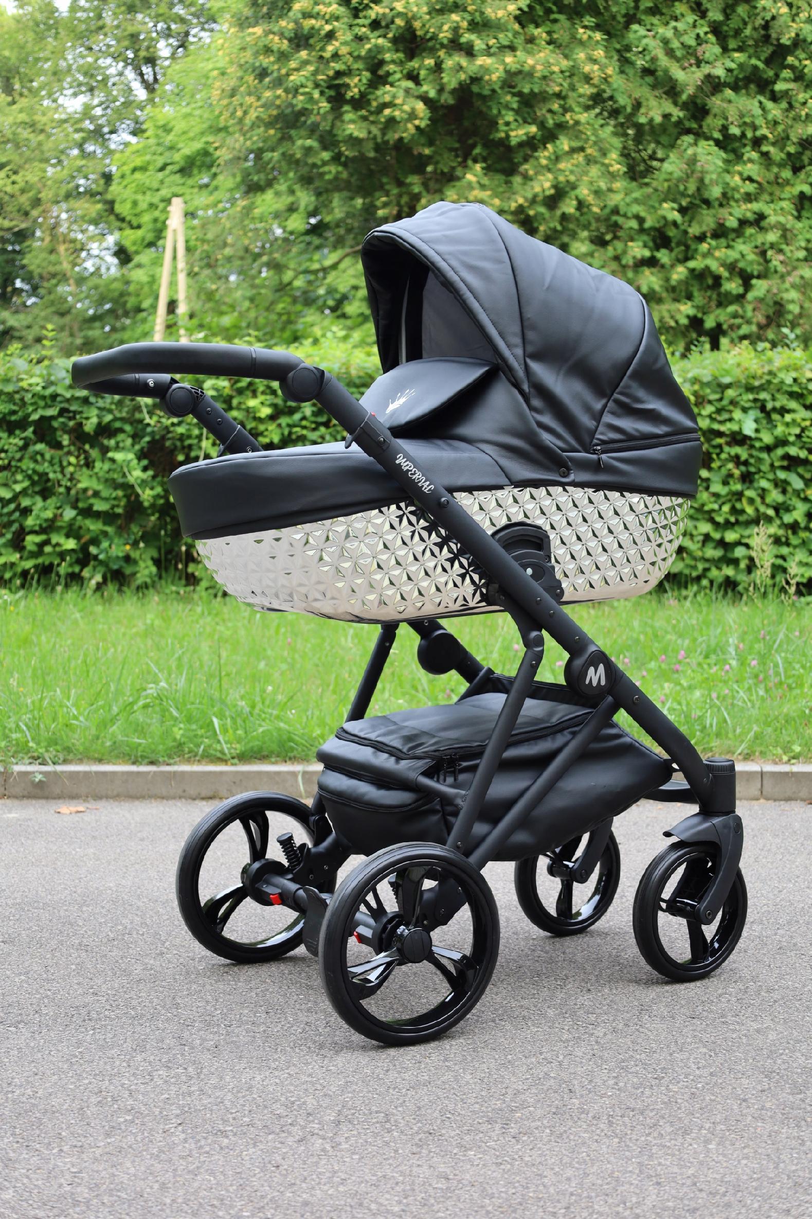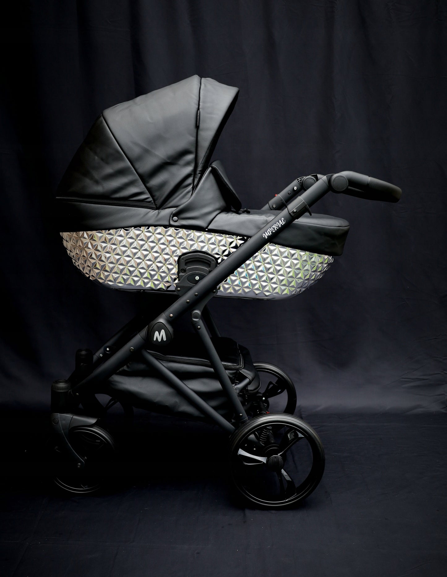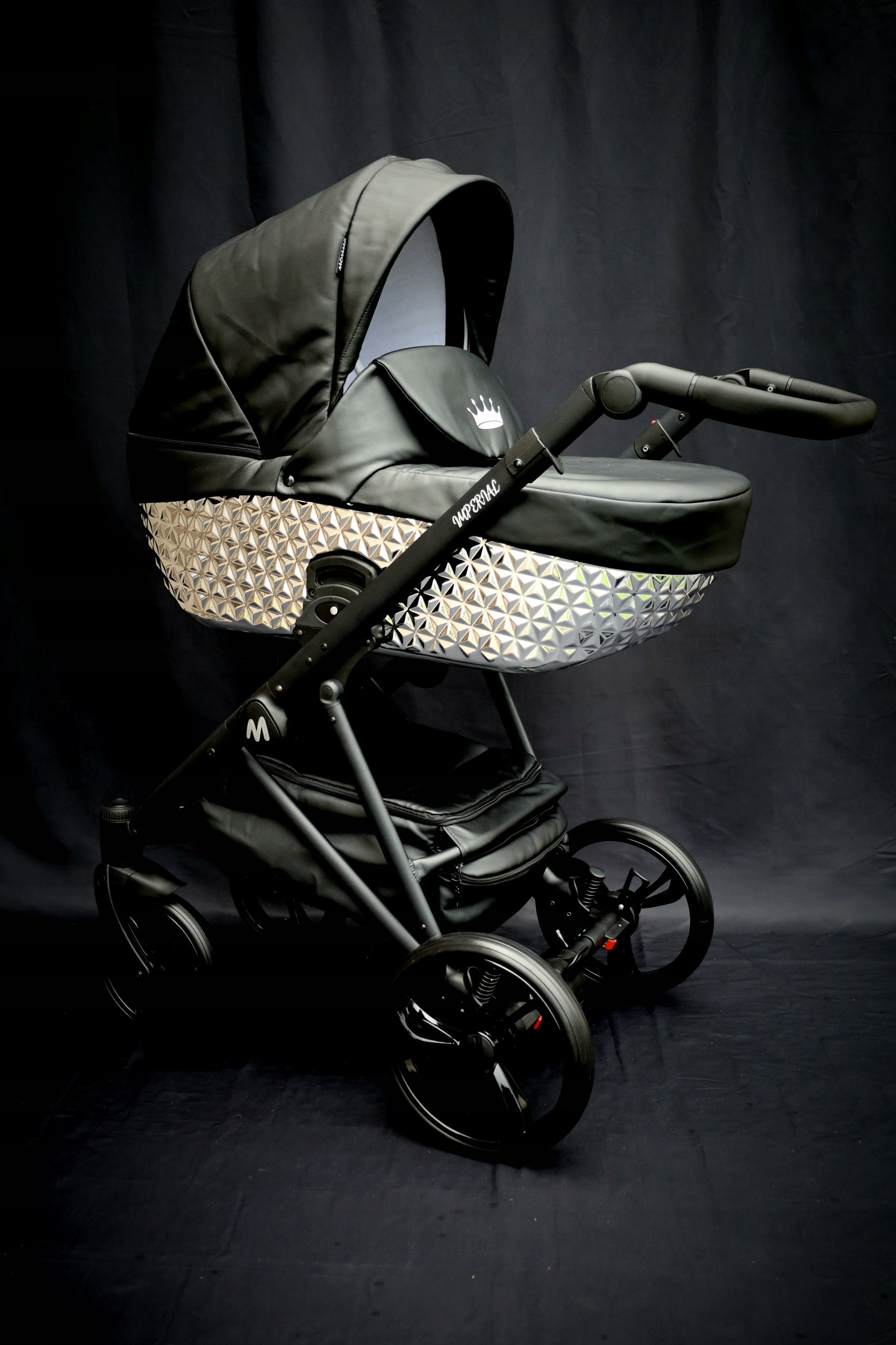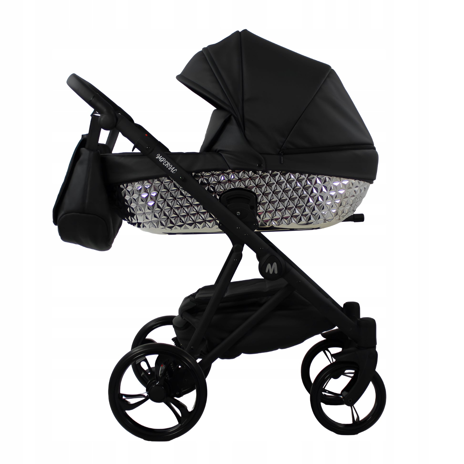 MOMMO IMPERIAL Ekskluzywny Wózek Dziecięcy - Black Silver Eko Skóra - 3w1
